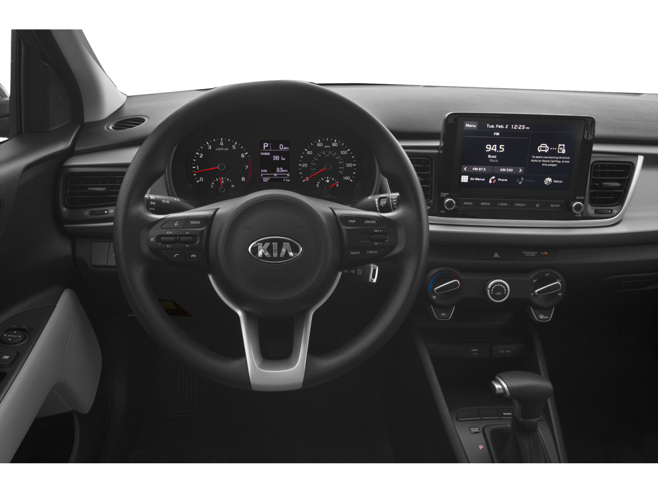 6 Speakers, ABS brakes, Air Conditioning, AM/FM radio, Apple CarPlay & Android Auto, Brake assist, Bumpers: body-color, Driver door bin, Driver vanity mirror, Dual front impact airbags, Dual front side impact airbags, Electronic Stability Control, Front anti-roll bar, Front Bucket Seats, Front Center Armrest, Front reading lights, Front wheel independent suspension, Fully automatic headlights, Heated door mirrors, Illuminated entry, Low tire pressure warning, Occupant sensing airbag, Outside temperature display, Overhead airbag, Overhead console, Panic alarm, Passenger door bin, Passenger vanity mirror, Power door mirrors, Power steering, Power windows, Radio: AM/FM/MP3 Audio System, Rear window defroster, Remote keyless entry, Speed control, Speed-sensing steering, Split folding rear seat, Steering wheel mounted audio controls, Tachometer, Tilt steering wheel, Traction control, Trip computer, Variably intermittent wipers, Wheels: 15 x 5.5J Steel w/Full Covers, and Woven Cloth Seat Trim.
