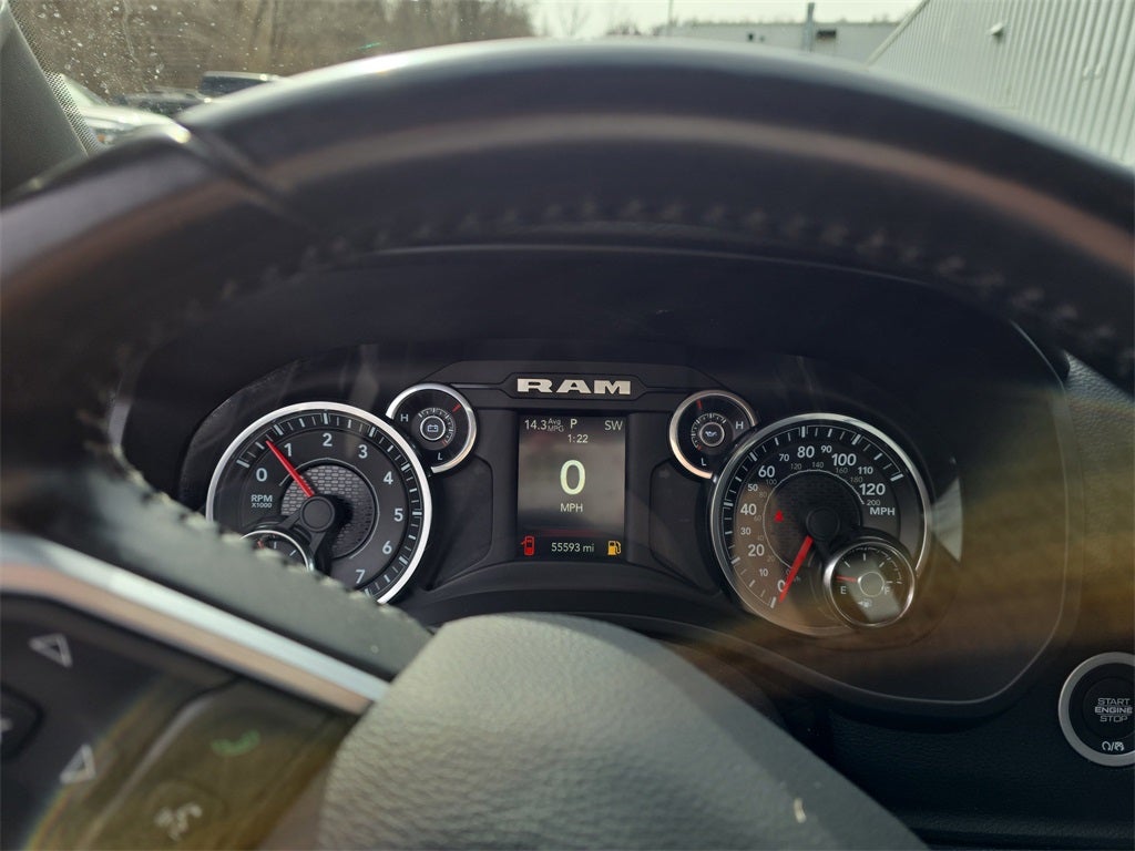 Big Horn Level 1 Equipment Group (Auto-Dimming Exterior Driver Mirror, Auto-Dimming Rear-View Mirror, Black Premium Power Mirrors, Class IV Receiver Hitch, Cluster 3.5 TFT Color Display, Exterior Mirrors Courtesy Lamps, Exterior Mirrors w/Supplemental Signals, Foam Bottle Insert (Door Trim Panel), For More Info, Call 800-643-2112, Glove Box Lamp, Power 4-Way Driver Lumbar Adjust, Power 8-Way Driver Seat, Power Adjustable Pedals, Power-Folding Mirrors, Radio: Uconnect 4 w/8.4 Display, Rear Dome w/On/Off Switch Lamp, Rear Power Sliding Window, Rear Window Defroster, SiriusXM Radio Service, SiriusXM Satellite Radio, Sun Visors w/Illuminated Vanity Mirrors, and Universal Garage Door Opener), Quick Order Package 25Z Big Horn (Big Horn Badge), 3 Rear Seat Head Restraints, 3.21 Rear Axle Ratio, 4 Way Front Headrests, 4-Wheel Disc Brakes, 40/20/40 Split Bench Seat, 48V Belt Starter Generator, 6 Speakers, ABS brakes, Air Conditioning, Alloy wheels, AM/FM radio, Anti-Spin Differential Rear Axle, Black Exterior Mirrors, Brake assist, Bumpers: chrome, Cloth Bench Seat, Compass, Delay-off headlights, Driver door bin, Dual front impact airbags, Dual front side impact airbags, Electronic Stability Control, Front anti-roll bar, Front Center Armrest w/Storage, Front fog lights, Front License Plate Bracket, Front reading lights, Front Seat Back Map Pockets, Front wheel independent suspension, Fully automatic headlights, GPS Antenna Input, Heated door mirrors, Illuminated entry, Integrated Voice Command w/Bluetooth®, Leather steering wheel, Low tire pressure warning, Manual Adjust 4-Way Front Passenger Seat, MOPAR Front & Rear Rubber Floor Mats, Occupant sensing airbag, Outside temperature display, Overhead airbag, Overhead console, Panic alarm, ParkView Rear Back-Up Camera, Passenger door bin, Passenger vanity mirror, Power door mirrors, Power steering, Power windows, Radio data system, Radio: Uconnect 3 w/5 Display, Rear 60/40 Folding Seat, Rear anti-roll bar, Rear seat center armrest, Rear step bumper, Rear Wheelhouse Liners, Remote keyless entry, Remote Start System, Speed control, Split folding rear seat, Steering wheel mounted audio controls, Tachometer, Telescoping steering wheel, Tilt steering wheel, Traction control, Trip computer, Variably intermittent wipers, Voltmeter, and Wheels: 18 x 8 Cast-Aluminum Painted.